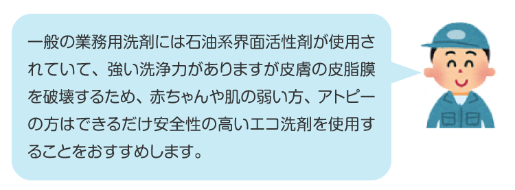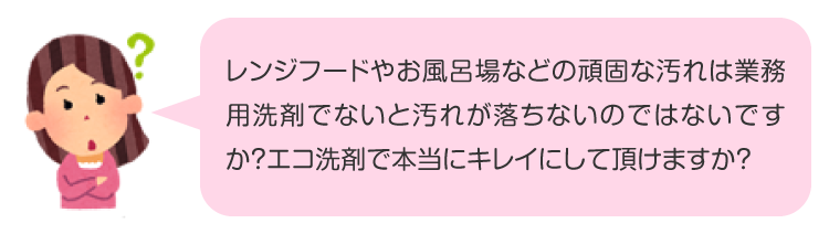 ※一部エコ洗剤では落ちないヨゴレについては、お客様に了解を頂いたうえでなるべく安全な洗剤を使わせていただきます