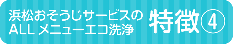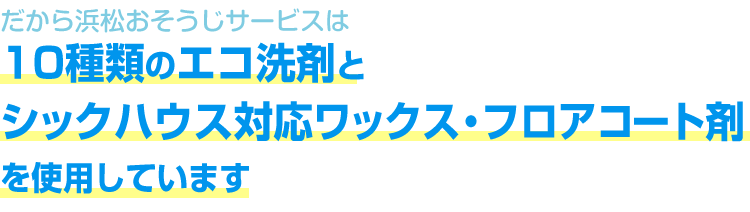 浜松おそうじサービスでは様々なエコ洗剤を洗浄力、生分解能力、安全性などの面から選りすぐり、10種類のエコ洗剤とワックス・コート剤などを使用し、お客様の①健康、②素材への配慮、③海を汚さないの3つの目的で、ハウスクリーニングにおいて「ALLメニューエコ洗浄」を実施しています。