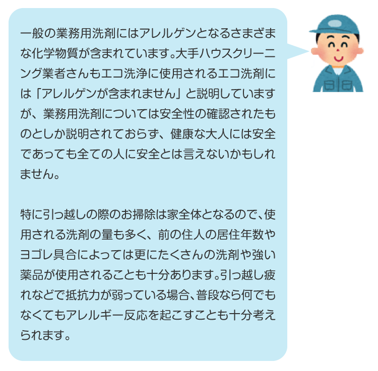 大手ハウスクリーニング業者さんでは「エアコンクリーニング」のみエコ洗浄を実施していますが、キッチン・フロ・トイレ・洗面など他のメニューについては業務用洗剤でしか対応されていません。業務用洗剤に含まれる様々な化学物質が空気中に揮発することを考えると、抵抗力の弱い赤ちゃんの口に入るものには特に注意してあげたいものです。