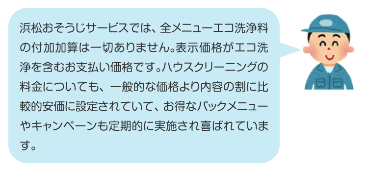 業務用洗剤はエコ洗剤に比べると比較的安価で作業効率も良いので、お掃除業者さんにとってはメリットが大きいですが、浜松おそうじサービスでは会社の利益や効率よりもまず第一に大切にされるべきものは、お客様とご家族の健康と安全という考えから、全メニューエコ洗浄にこだわり「安心・安全」なハウスクリーニングをご提供させていただいております。