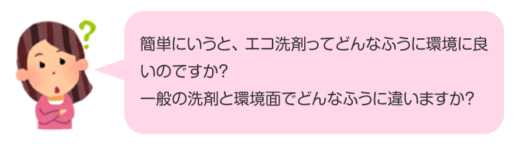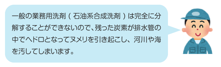 天然の界面活性剤の場合、自然界の微生物のちからで水と二酸化炭素に分解され、きちんと自然に還ります。(これを生分解といいます)